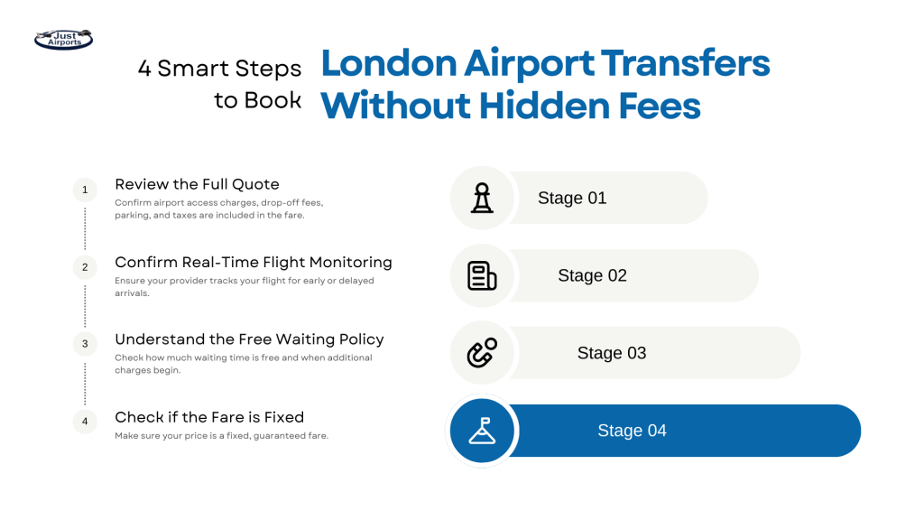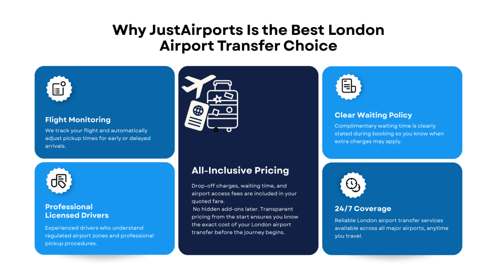 Choosing experienced providers such as JustAirports London ensures airport charges, waiting policies, and pricing structures are clearly confirmed before travel.