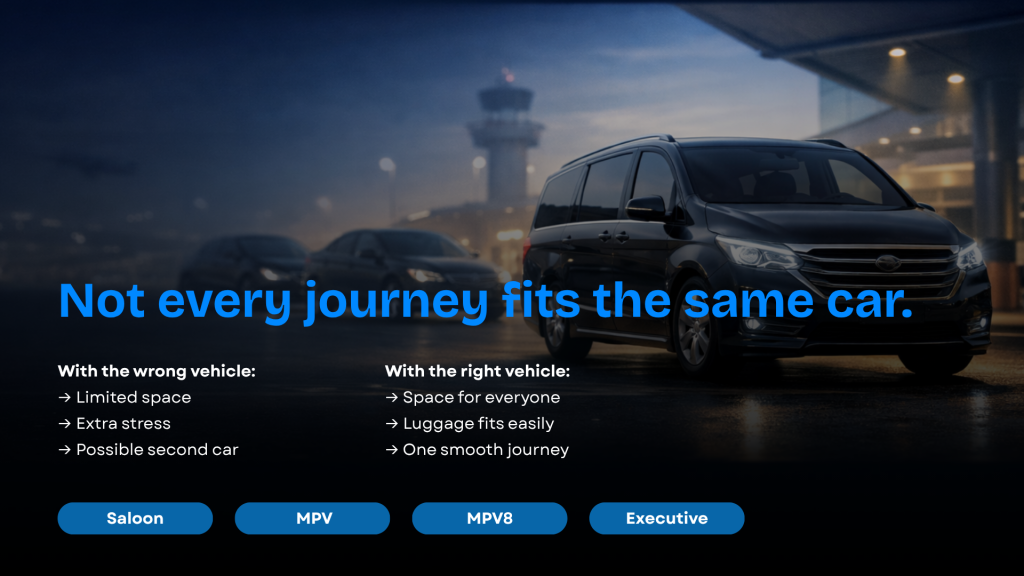 JustAirports solves this structurally. When completing your London airport transfers booking online, you select the vehicle class appropriate to your needs: